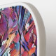 An abstract art design of a small woodland tree in blues, reds and brown colours.