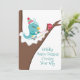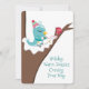 Super cute bird sitting in a tree, wearing a winter hat, with knitting needles and yarn on this "handmade with love" knitting Christmas card for gifting your list with hand crafted wearables and gifts.