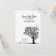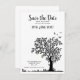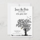 A simple yet elegant save the date featuring a tree/birds and hanging birdcage