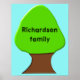 This customizable family tree poster has a green tree on it. The text says Richardson family but is customizable to allow you to enter your own family name. The text is black and the font gives it a charcoal look. The background colour is sky blue and there is a black border around the poster. The design is available on several different sizes of poster, the largest of which is shown here.