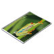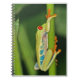 Photo of a colourful tree frog climbing on the stem of a plant. The frog has red eyes, orange feet and blue stripes up the side of his body, which is green otherwise. This is called a Gaudy Leaf Tree Frog, and the photograph was taken in the tropics of Costa Rica.