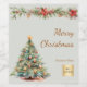 A soft sage green background on the front decorated with a watercolored hand-drawn pine tree with red and golden ornaments. Some stars and a Christmas decorated garland with cones and red Poinsettia flowers.