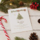 A winter invitation for a Christmas party. A white background on the front decorated with a watercolored hand-drawn pine tree with red and golden ornaments. Some stars and a Christmas decorated garland with cones and red Poinsettia flowers. Personalise and add your party details.