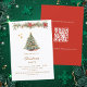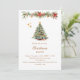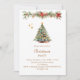 A winter invitation for a Christmas party. A white background on the front decorated with a watercolored hand-drawn pine tree with red and golden ornaments. Some stars and a Christmas decorated garland with cones and red Poinsettia flowers. Personalise and add your party details.