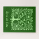 Puzzle in a stylised, branch and flower, tree of life design in light green on a dark, pine green background