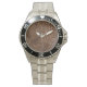 Has heft and feel of expensive stainless steel quartz watches. Good band with safety catch. I removed links, which is easy because engraved arrows show direction to push the linking pins. As always by this seller, the image (a railroad logo) is a perfect reproduction of my emailed image, and is precisely spaced and aligned.