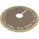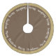 Holiday tree skirt is shown in a latte brown and matte gold colour with ivory text of Merry Christmas written in script all the way around the tree skirt with a solid colour border.