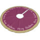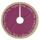 Holiday tree skirt is shown in a cassis wine-purple and matte gold colour with pinot noir pink text of Merry Christmas written in script all the way around the tree skirt with a solid colour border.