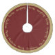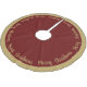 Holiday tree skirt is shown in a burgundy red and matte gold colour with matte gold-colour text of Merry Christmas written in script all the way around the tree skirt with a solid colour border.