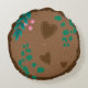 A cute round pillow for the nursery room with a woodland theme . It features a tree slice with a few leaves  , some pink berries and a little bear on the front side . You can also add the baby's initial and first name . On the back your have brown faux stitched hearts instead of the bear .