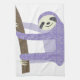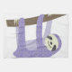 A happy sloth hangs from a tree branch in this light hearted graphic. This sloth is especially special because he doesn't have fur - he has a lovely purple print!