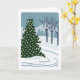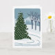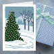 Winter landscape with snow, trees, and distant hills. The tree in the front has festive lights all over. Digital composition of hand-painted acrylic on paper. This modern style illustration includes the colors blue, green, white, cream. Inside: Blank