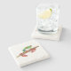 The coasters are gorgeous, a quality feel and heavy weight. They look like a precious archeological find. A rustic stone juxtaposed with a modern floral black and white print. I like the way the print goes slightly imperfect on the cut stone edges giving them a kind-of natural beauty.