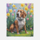 A cheerful dog sits peacefully on lush green grass, surrounded by colourful spring blooms under a soft blue sky. This digital oil painting captures a serene moment with expressive brushstrokes, warm colours, and a sense of gentle joy.