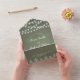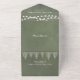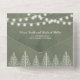 Trees and string lights on limed ash green all in one wedding invitation. It features white trees and string lights on green colour. The names are in script typography and the tear off RSVP card can be detached.