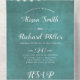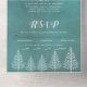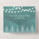 Trees and string lights on stained teal blue winter all in one wedding invitation. It features white trees and string lights on stained teal blue background. The names are in script typography and the tear off RSVP card can be detached.