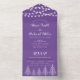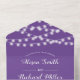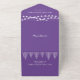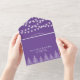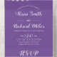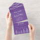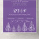 Trees and string lights on purple winter all in one wedding invitation. It features white trees and string lights on purple background. The names are in script typography and the tear off RSVP card can be detached.