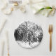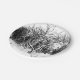 Paper plates in a Winter scene of snow-covered trees with a winter woodland background - digitally enhanced photography in black and white