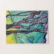 This modern abstract landscape features a beautiful scene with several trees standing in the mountain foothills with several mountains in the background. This colourful jigsaw puzzle features shades of blue, green, teal, yellow, brown, and black with a touch of red toned hues. It's a perfect addition to a family game night or a great gift for anyone who loves puzzles or abstract art.