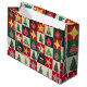 Trees, ornaments, and stars on red, green and ecru squares creates a cute and fun gift bag with a mid-century aesthetic. Perfect for all your holiday gifts.