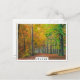 Postcard with deciduous trees with foliage in fall colours and fallen leaves on a path in a forest in Hoge Veluwe nature reserve in the Netherlands during autumn season with a white edge and the text 'Veluwe'.