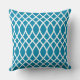 Square accent pillow design features a stylish wavy diamond trellis framework pattern. Colours are white and teal blue