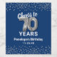 Custom elegant 70th birthday party wine bottle labels featuring a trendy blue background that can be changed to any colour, silver sparkly glitter, seventieth silver hellium balloons, and a modern text template that is easy to personalise.