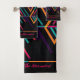 A trendy 80s design, this bath towel set features a black background with pink, purple, blue, orange stripes. Customise your name in pink.