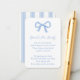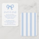 This baby shower enclosure card design features a hand painted blue bow. The wording is a poem requesting guests to bring a book instead of a card but all of the text can be customised to your needs. On the reverse is a blue and white Regency stripes pattern.