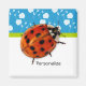 Personalise by adding your name to this trendy blue and white floral pattern with a green stripe and a cute red spotted ladybug.