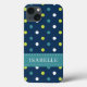 Stylish and fun blue, green and white polka dot pattern on a dark navy blue background with a white custom name template. Add a personal touch to your iphone 13 case by customising the name for yourself or to make it a gift.