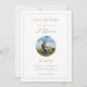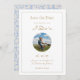 Chic & fresh with youthful charm. This Save the Date card features a set of trendy and modern warm golden fonts, circle couple photo frame against a white background. The back of the card boasts a playful floral blue jacket. Personalise to make it your own.