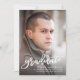 Announce your graduation with this stylish photo graduation announcement featuring the word "Graduate" in a trendy brush script in white against a partly transparent dark gradient for contrast. Card has a blue and white pattern back side.
