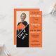 The right side of the invitation is dedicated to the event details, set against a clean orange background.