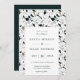 Trendy terrazzo pattern, wedding invitation. Modern artisan stone pattern design in a chic colour palette of dark emerald green, dusty blue and sandy beige. Simple and elegant typography design style template in coordinating emerald green colour fonts and matching solid colour backing.