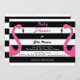 Fun pink flamingos accent this trendy Baby Shower Invitation on a striped black and white background, making it perfect for a summer BBQ, luau, gathering by the pool, or flamingo themed shower.