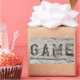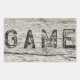 Rustic, weathered wood sign with the word "Game" carved into it.