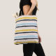 Beautiful tote bag with pattern of golden yellow, light blue, white, black and peach stripes.