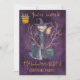 Purple orange watercolor modern style creepy typography Halloween costume party invitation featuring a wicked witch with broom, brushwood, grey charcoal hat and dress, candles and a black cat. Personalise it on front and back! Suitable for trendy Halloween witches or costume parties, bridal showers or baby showers, birthdays or other Halloween inspired parties. ------- If you need help in personalising it, please contact me!
