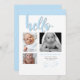 A ribbon of blue with white polkadots creates a background for a big "hello" and and features three photo windows in this handsome birth announcement. (<a href='http://www.freepik.com/free-vector/hello-illustration_1055182.htm'>Designed by Freepik</a>). <br/><br/>The card is easy to customise with your wording, font, font colour, paper shape options and choice of six paper types.<br/><br/>Not exactly what you're looking for? All our products can be custom designed to meet your needs at no extra charge.<br/><br/>Simply contact us at askcottonlamb@gmail.com<br/><br/>Coordinating products available: Just ask us!