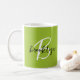 This elegant personalised coffee mug features a monogram and first name in modern black and white script on a lime green background.