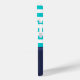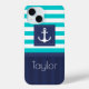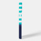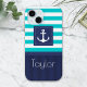 Modern nautical iPhone case with turquoise & navy blue striped pattern and customisable text.