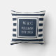 Elegant personalised initials monogram throw pillow featuring a navy blue and white striped pattern with your initials and family name with your established date set in a navy blue-bordered square with a classic white text. Designed by Thisisnotme©