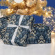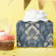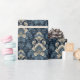 Vintage style design for wrapping paper features classic navy blue and beige ornamental damask.