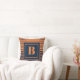 Trendy navy blue and orange horizontal-striped decorator pillow with a large monogram on front and back.