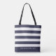 Trendy navy blue and white stripe pattern, tote bag. Personalise with name and bridal party title.
