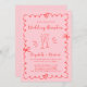 Trendy retro-inspired pink and red wedding reception invitation featuring a wavy frame adorned with coquette bows, whimsical hand drawn illustrations of hearts and champagne glasses, and "Wedding Reception" and the names of the bride and groom in a fun, playful script.