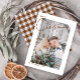 This beautiful, modern Trendy Plaid Merry Christmas Script Photo Christmas Holiday Card features your vertical wedding photo behind a white border. The word 'Merry' appears in breakout border fashion in the upper left, followed by the word "Christmas" in a beautiful, bold hand lettered typography, both in black. The card is personalised with your name and year at bottom left, in the white frame margin, also breaking out of the border, and features a stylish salted caramel and white buffalo check plaid backer. Perfect for sending warm holiday wishes to family and friends, this card captures the elegance of a special moment and the joy of your new journey together. Ideal for winter weddings, holiday announcements, or thank you notes, this card is as versatile as it is timeless.
