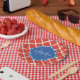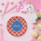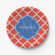 Trendy orange-red Moroccan quatrefoil pattern paper plates with a blue badge you can personalise by adding your name and monogram initial to. This is part of the Cherry Tomato and Palace Blue Spring Quatrefoil Collection