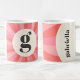 Modern, trendy mug with your monogram initial in dark grey on a cream coloured circle on a pink sunburst background. On the other side is your name on a cream coloured half circle. All colours can be edited in the design tool.